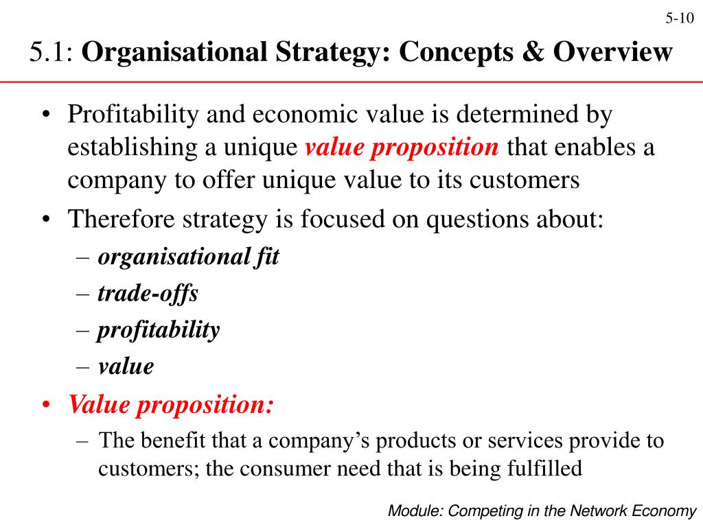 5.1: Organisational Strategy: Concepts & Overview • Profitability and economic value is determined by establishing a unique value propositionthat enables a company to offer unique value to its customers • Therefore strategyis focused on questions about: • organisational fit • trade-offs • profitability • value • Value proposition: • The benefit that a company’s products or services provide to customers; the consumer need that is being fulfilled
