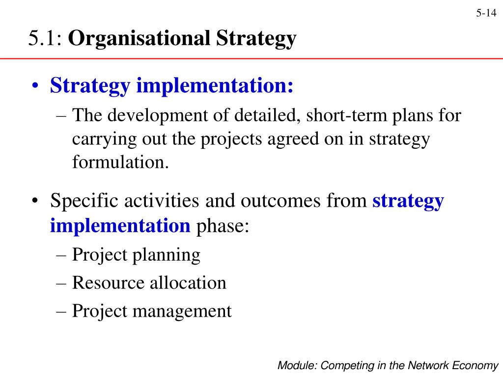5.1: Organisational Strategy • Strategy implementation: • The development of detailed, short-term plans for carrying out the projects agreed on in strategy formulation. • Specific activities and outcomes from strategy implementation phase: • Project planning • Resource allocation • Project management