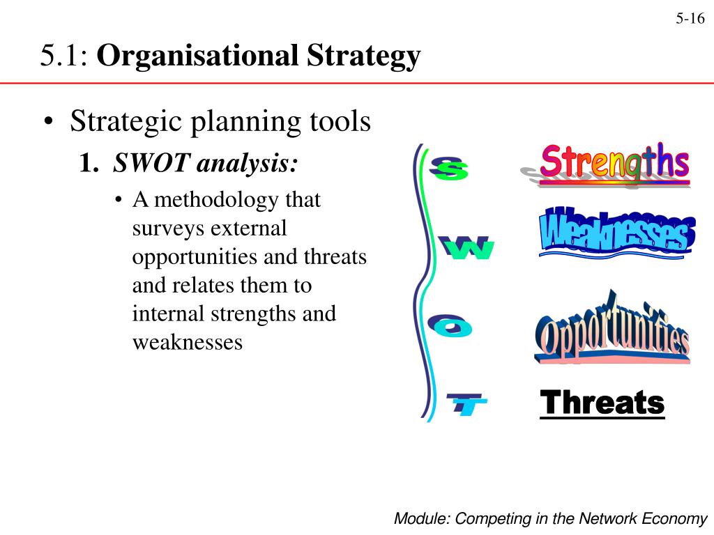 5.1: Organisational Strategy • Strategic planning tools 1. SWOT analysis: • A methodology that surveys external opportunities and threats and relates them to internal strengths and weaknesses Strengths Weaknesses S W O T Opportunities Threats
