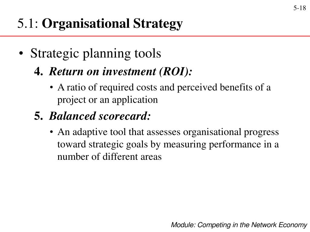 5.1: Organisational Strategy • Strategic planning tools 4. Return on investment (ROI): • A ratio of required costs and perceived benefits of a project or an application 5. Balanced scorecard: • An adaptive tool that assesses organisational progress toward strategic goals by measuring performance in a number of different areas