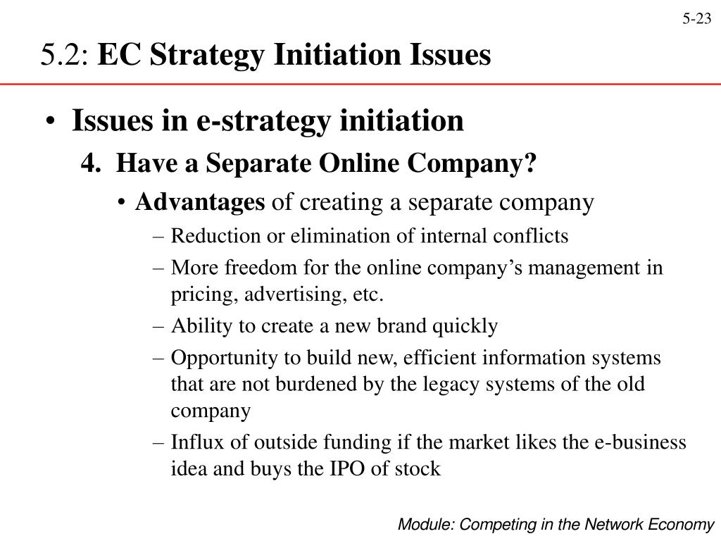 5.2: EC Strategy Initiation Issues • Issues in e-strategy initiation 4. Have a Separate Online Company? • Advantages of creating a separate company • Reduction or elimination of internal conflicts • More freedom for the online company’s management in pricing, advertising, etc. • Ability to create a new brand quickly • Opportunity to build new, efficient information systems that are not burdened by the legacy systems of the old company • Influx of outside funding if the market likes the e-business idea and buys the IPO of stock