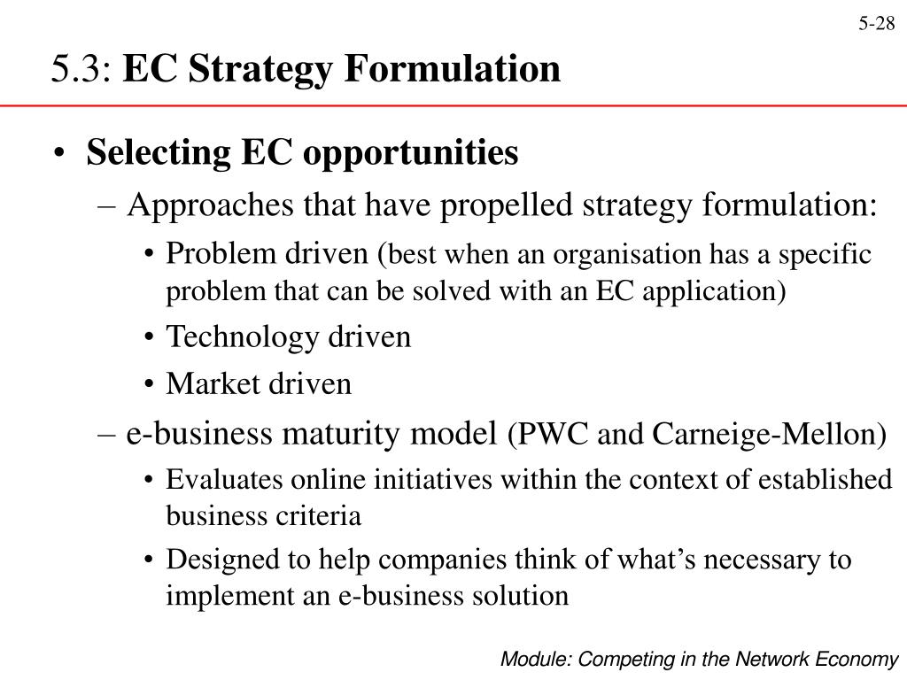 5.3: EC Strategy Formulation • Selecting EC opportunities • Approaches that have propelled strategy formulation: • Problem driven (best when an organisation has a specific problem that can be solved with an EC application) • Technology driven • Market driven • e-business maturity model (PWC and Carneige-Mellon) • Evaluates online initiatives within the context of established business criteria • Designed to help companies think of what’s necessary to implement an e-business solution