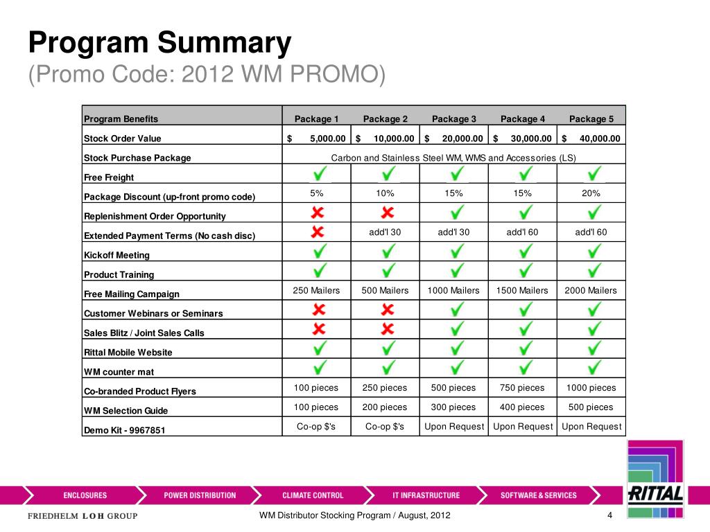 Program Details • Discount is entered upfront via Promo Code: 2012 WM PROMO • Eligible product: • Xpress (carbon & stainless steel) WM, WMS and Accessories • Product will be shipped at Rittal‘s convenience within 30 days of order • Replenishment orders: • One replenishment order can be made for packages 3, 4 & 5 • Replenishment order must be placed before October 15, 2012 • Will be shipped within 30 days of order • All product is returnable as part of standard stock rotation in accordance with Rittal‘s terms and conditions WM Distributor Stocking Program / August, 2012