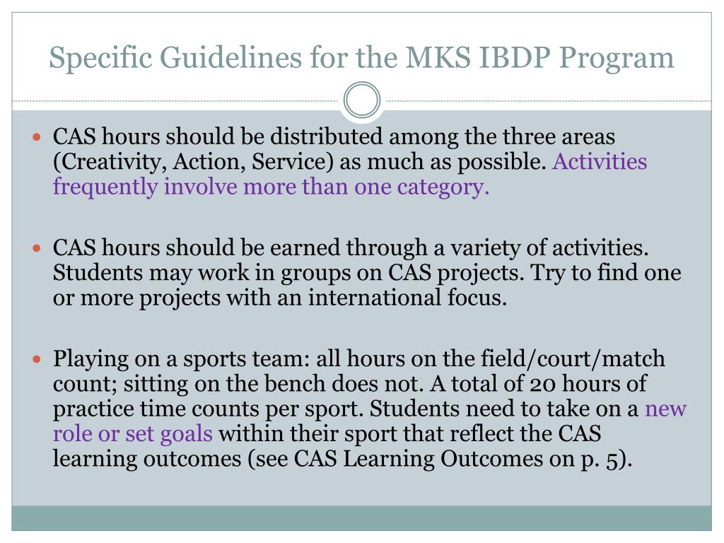 Specific Guidelines for the MKS IBDP Program • CAS hours should be distributed among the three areas (Creativity, Action, Service) as much as possible. Activities frequently involve more than one category. • CAS hours should be earned through a variety of activities. Students may work in groups on CAS projects. Try to find one or more projects with an international focus. • Playing on a sports team: all hours on the field/court/match count; sitting on the bench does not. A total of 20 hours of practice time counts per sport. Students need to take on a new role or set goals within their sport that reflect the CAS learning outcomes (see CAS Learning Outcomes on p. 5).