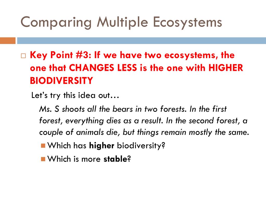 Comparing Multiple Ecosystems • Key Point #3: If we have two ecosystems, the one that CHANGES LESS is the one with HIGHER BIODIVERSITY Let’s try this idea out… Ms. S shoots all the bears in two forests. In the first forest, everything dies as a result. In the second forest, a couple of animals die, but things remain mostly the same. • Which has higher biodiversity? • Which is more stable?