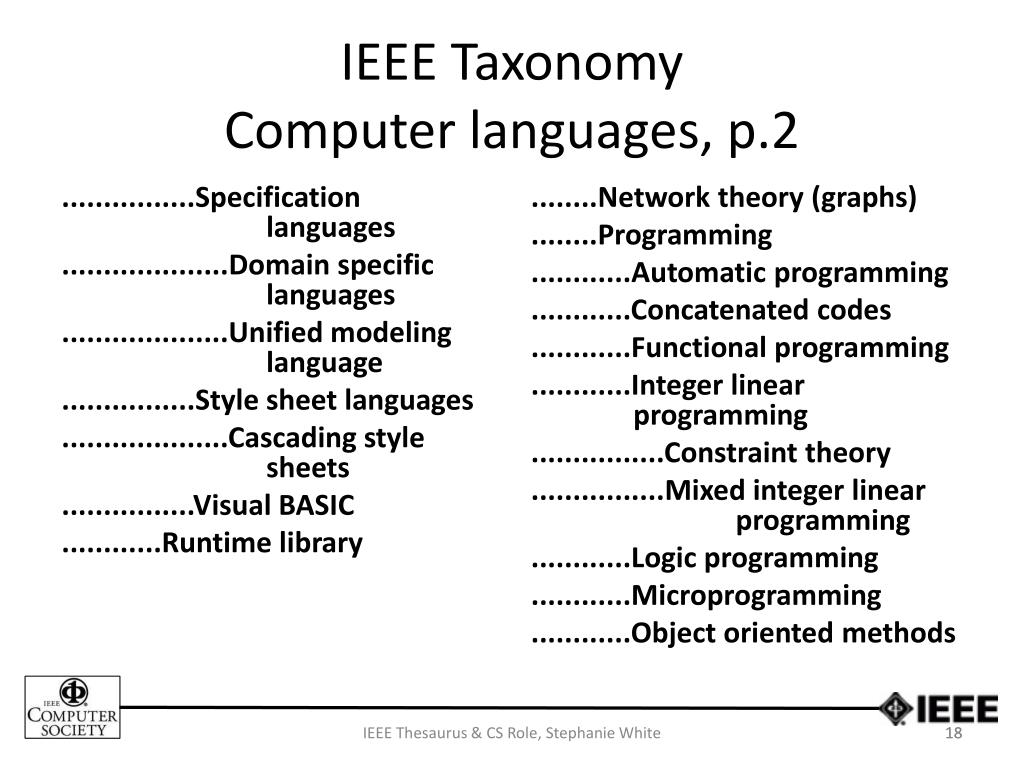 IEEE TaxonomyComputer languages, p.2 ................Specification languages ....................Domain specific languages ....................Unified modeling language ................Style sheet languages ....................Cascading style sheets ................Visual BASIC ............Runtime library ........Network theory (graphs) ........Programming ............Automatic programming ............Concatenated codes ............Functional programming ............Integer linear programming ................Constraint theory ................Mixed integer linear programming ............Logic programming ............Microprogramming ............Object oriented methods IEEE Thesaurus & CS Role, Stephanie White