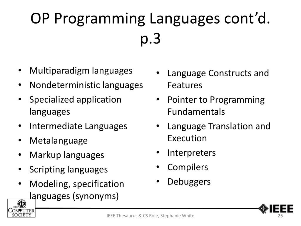 Ontology Project (OP)Programming Languages p.2 • Logic • Declarative • Constraint logic languages • Imperative • Event-Driven • Data flow languages • Concurrent Languages • Very high level languages (aka Fourth Generation Languages) • Query Languages • Assembly Languages • Design languages • Extensible languages • Microprogramming languages IEEE Thesaurus & CS Role, Stephanie White