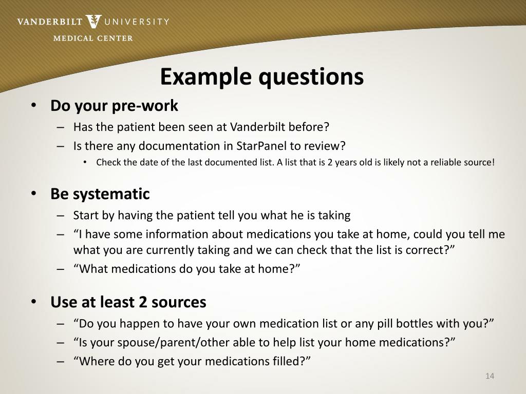 Example questions • Do your pre-work • Has the patient been seen at Vanderbilt before? • Is there any documentation in StarPanel to review? • Check the date of the last documented list. A list that is 2 years old is likely not a reliable source! • Be systematic • Start by having the patient tell you what he is taking • “I have some information about medications you take at home, could you tell me what you are currently taking and we can check that the list is correct?” • “What medications do you take at home?” • Use at least 2sources • “Do you happen to have your own medication list or any pill bottles with you?” • “Is your spouse/parent/other able to help list your home medications?” • “Where do you get your medications filled?”