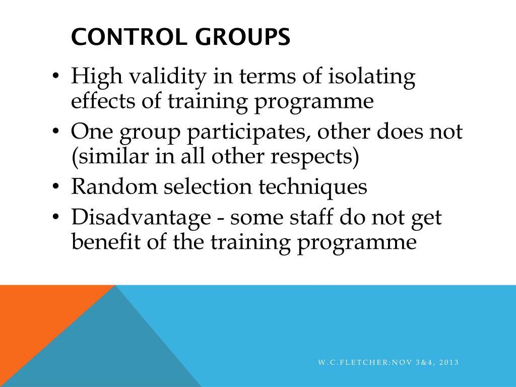 CONTROL GROUPS • High validity in terms of isolating effects of training programme • One group participates, other does not (similar in all other respects) • Random selection techniques • Disadvantage - some staff do not get benefit of the training programme W.C.Fletcher:Nov 3&4, 2013