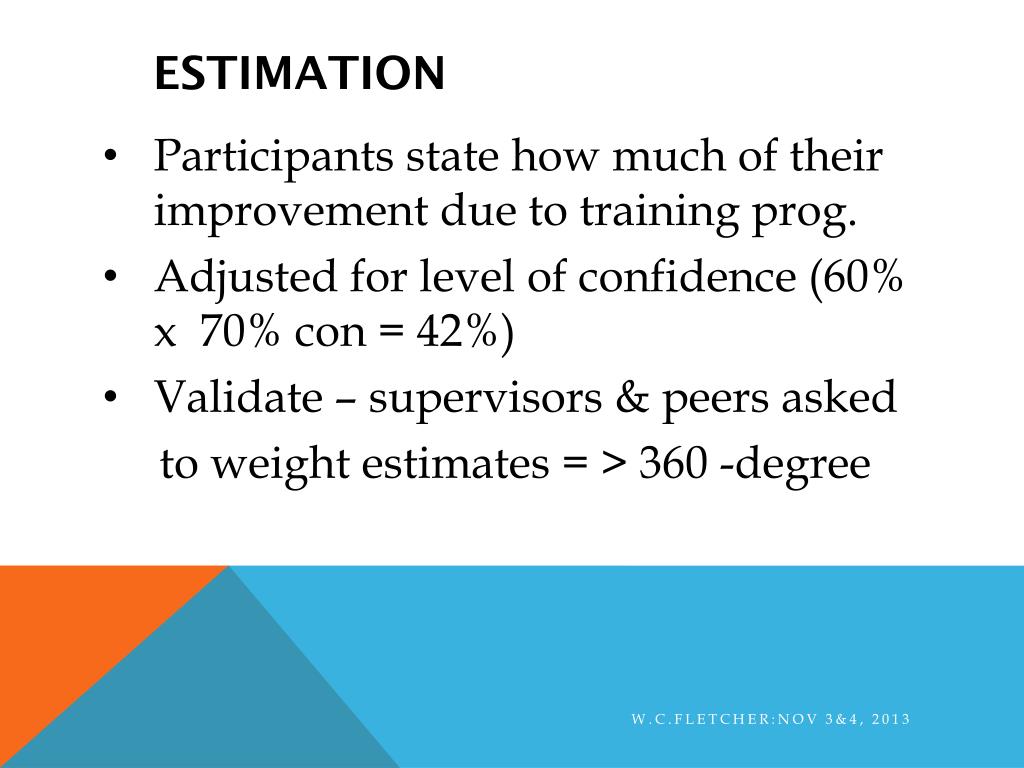 ESTIMATION • Participants state how much of their improvement due to training prog. • Adjusted for level of confidence (60% x 70% con = 42%) • Validate – supervisors & peers asked • to weight estimates = > 360 -degree W.C.Fletcher:Nov 3&4, 2013