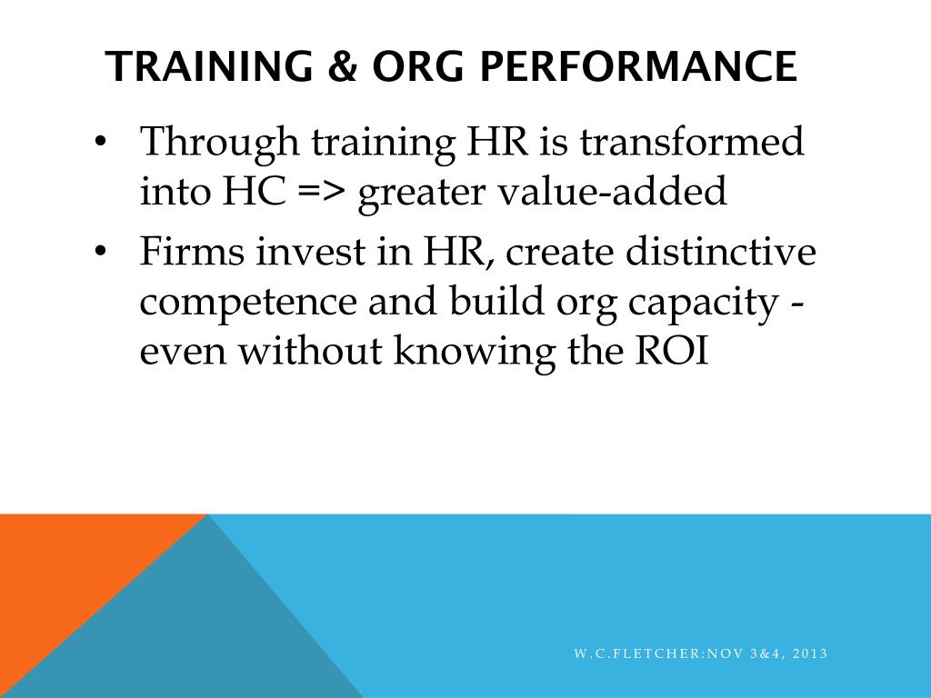 Training & org performance • Through training HR is transformed into HC => greater value-added • Firms invest in HR, create distinctive competence and build org capacity - even without knowing the ROI W.C.Fletcher:Nov 3&4, 2013