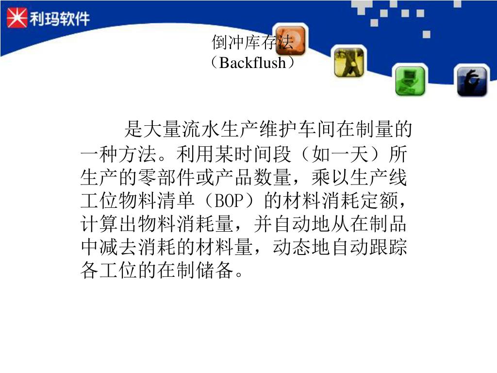 倒冲库存法(Backflush) 是大量流水生产维护车间在制量的一种方法。利用某时间段(如一天)所生产的零部件或产品数量,乘以生产线工位物料清单(BOP)的材料消耗定额,计算出物料消耗量,并自动地从在制品中减去消耗的材料量,动态地自动跟踪各工位的在制储备。