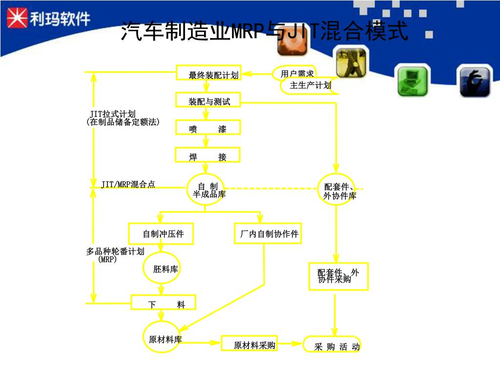 用户需求 最终装配计划 主生产计划 装配与测试 JIT拉式计划 (在制品储备定额法) 喷 漆 焊 接 JIT/MRP混合点 自 制 配套件、 半成品库 外协件库 自制冲压件 厂内自制协作件 多品种轮番计划 (MRP) 胚料库 配套件、外 协件采购 下 料 原材料库 原材料采购 采 购 活 动 汽车制造业MRP与JIT混合模式