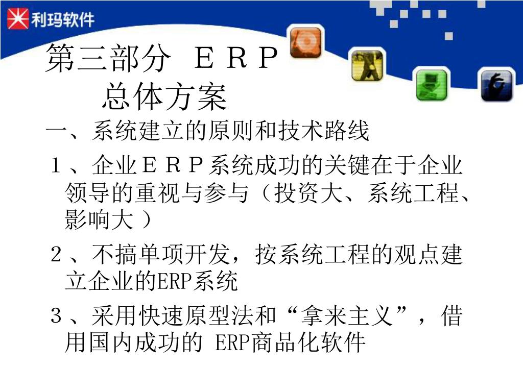 第三部分 ERP总体方案 一、系统建立的原则和技术路线 1、企业ERP系统成功的关键在于企业领导的重视与参与(投资大、系统工程、影响大 ) 2、不搞单项开发,按系统工程的观点建立企业的ERP系统 3、采用快速原型法和“拿来主义”,借用国内成功的ERP商品化软件