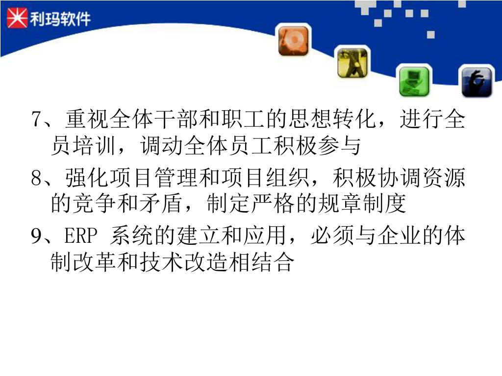 7、重视全体干部和职工的思想转化,进行全员培训,调动全体员工积极参与7、重视全体干部和职工的思想转化,进行全员培训,调动全体员工积极参与 8、强化项目管理和项目组织,积极协调资源的竞争和矛盾,制定严格的规章制度 9、ERP 系统的建立和应用,必须与企业的体制改革和技术改造相结合