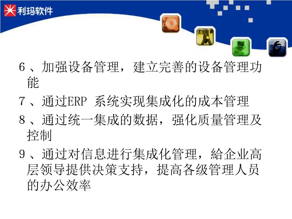 6、加强设备管理,建立完善的设备管理功能 7、通过ERP 系统实现集成化的成本管理 8、通过统一集成的数据,强化质量管理及控制 9、通过对信息进行集成化管理,給企业高层领导提供决策支持,提高各级管理人员的办公效率