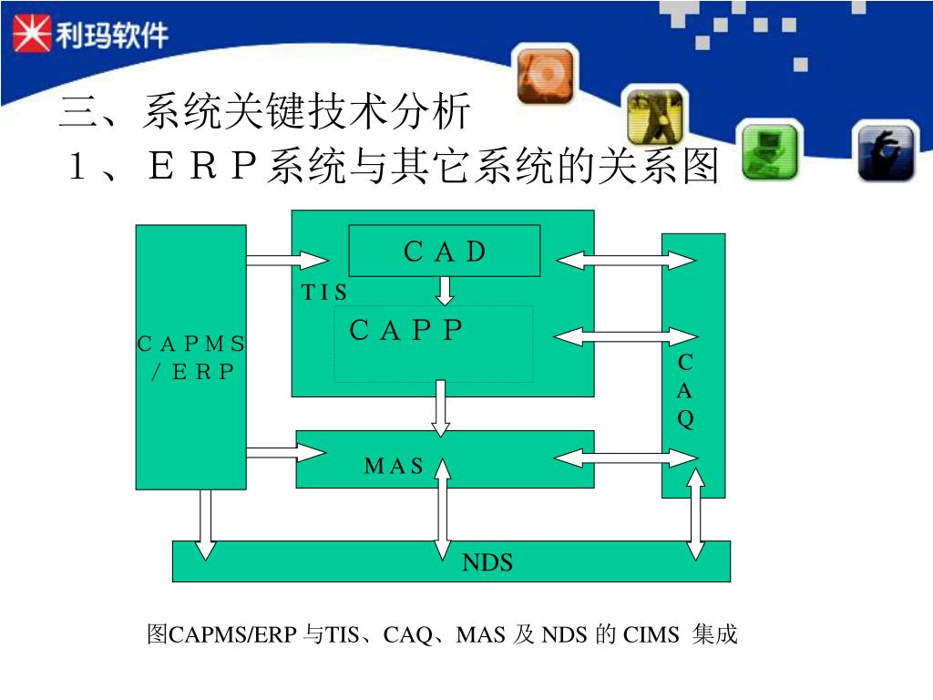 T I S CAPMS /ERP CAD C A Q CAPP M A S NDS 图CAPMS/ERP 与TIS、CAQ、MAS 及 NDS 的 CIMS 集成 三、系统关键技术分析 1、ERP系统与其它系统的关系图