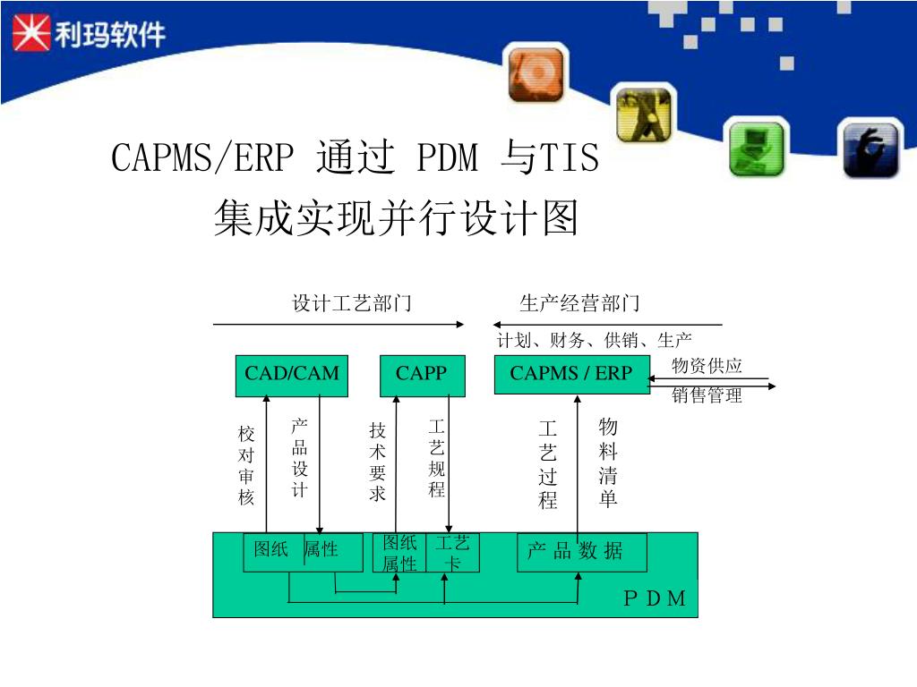 设计工艺部门 生产经营部门 计划、财务、供销、生产 物资供应 CAD/CAM CAPP CAPMS / ERP 销售管理 物料清单 产品设计 工艺规程 工艺过程 技术要求 校对审核 图纸 属性 图纸 属性 工艺 卡 产 品 数 据 PDM CAPMS/ERP 通过 PDM 与TIS 集成实现并行设计图
