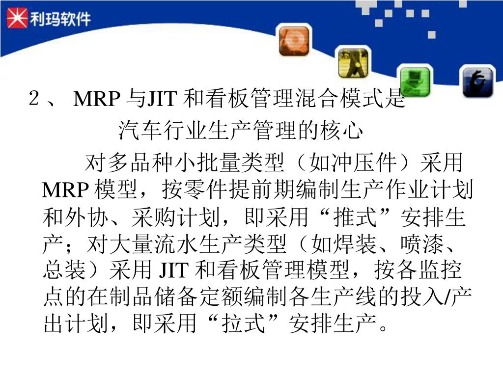 2、 MRP 与JIT 和看板管理混合模式是 汽车行业生产管理的核心 对多品种小批量类型(如冲压件)采用 MRP 模型,按零件提前期编制生产作业计划和外协、采购计划,即采用“推式”安排生产;对大量流水生产类型(如焊装、喷漆、总装)采用 JIT 和看板管理模型,按各监控点的在制品储备定额编制各生产线的投入/产出计划,即采用“拉式”安排生产。