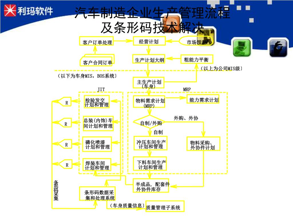 经营计划 市场预测 客户订单处理 粗能力平衡 生产计划大纲 客户合同订单 (以上为公司MIS级〕 (以下为车身MIS,BOS系统〕 主生产计划 (车身) JIT MRP 检验发交 能力需求计划 物料需求计划 R 计划和管理 (MRP) 外购、外协 总装(内饰)车 自制/外购 间计划和管理 R 自制 冲压车间生产 磷化喷漆 物料采购、 计划和管理 计划和管理 R 外协件计划 焊装车间 下料车间生产 计划和管理 R 计划和管理 条 半成品, 配套件 形 外协件库存 码 条形码数据采 采 集和处理系统 集 (车身质量信息〕 质量管理子系统 汽车制造企业生产管理流程及条形码技术解决