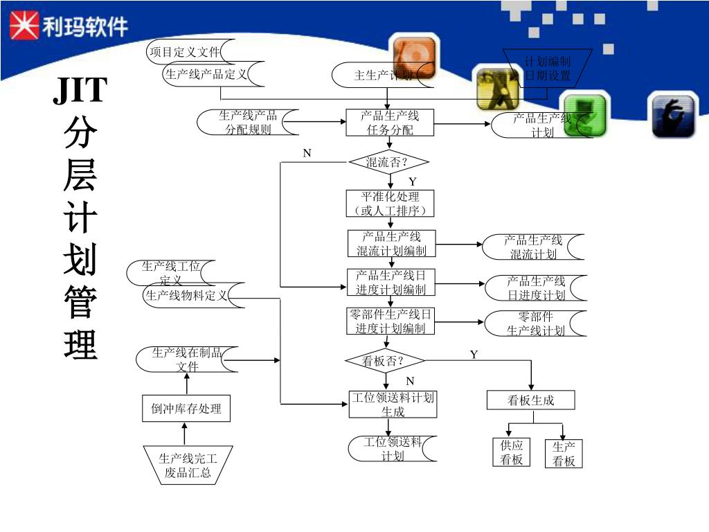 项目定义文件 JIT分层计划管理 计划编制 日期设置 生产线产品定义 主生产计划 产品生产线 任务分配 生产线产品 分配规则 产品生产线 计划 N 混流否? Y 平准化处理 (或人工排序) 产品生产线 混流计划编制 产品生产线 混流计划 生产线工位 定义 产品生产线日 进度计划编制 产品生产线 日进度计划 生产线物料定义 零部件生产线日 进度计划编制 零部件 生产线计划 Y 生产线在制品 文件 看板否? N 看板生成 工位领送料计划 生成 倒冲库存处理 工位领送料 计划 供应 看板 生产 看板 生产线完工 废品汇总