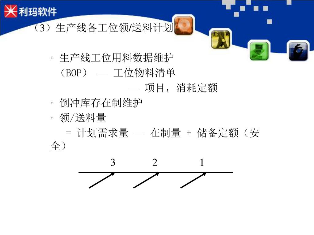 (3)生产线各工位领/送料计划 ▫ 生产线工位用料数据维护 (BOP) —工位物料清单 —项目,消耗定额 ▫ 倒冲库存在制维护 ▫ 领/送料量 = 计划需求量 —在制量 + 储备定额(安全) 3 2 1