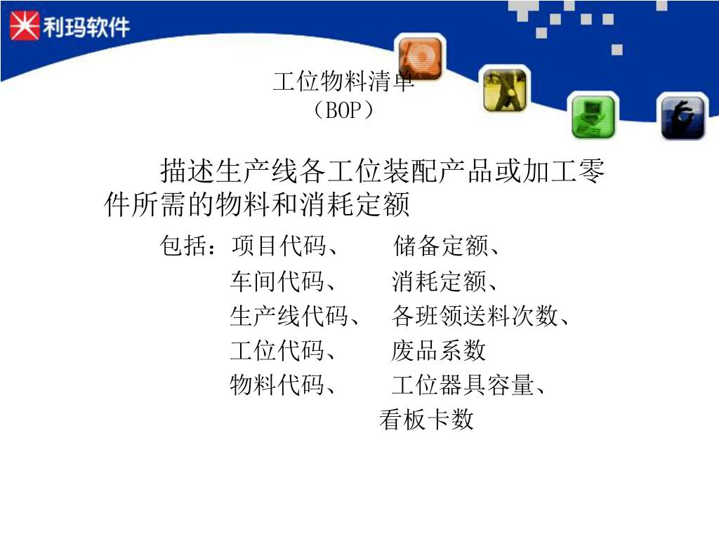 工位物料清单(BOP) 描述生产线各工位装配产品或加工零件所需的物料和消耗定额 包括:项目代码、 储备定额、 车间代码、 消耗定额、 生产线代码、 各班领送料次数、 工位代码、 废品系数 物料代码、 工位器具容量、 看板卡数