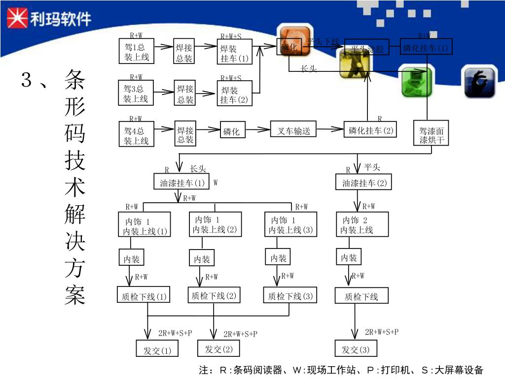 R+W R+W R+W+S 平头下线 驾1总 磷化 焊接 磷化挂车(1) 焊装 平头涂胶 装上线 总装 挂车(1) 长头 R+W R+W+S 驾3总 焊接 焊装 装上线 总装 挂车(2) R+W R 焊接 磷化挂车(2) 驾4总 叉车输送 驾漆面 磷化 总装 漆烘干 装上线 平头 长头 R R W 油漆挂车(1) 油漆挂车(2) R+W R+W R+W R+W 内饰 1 内饰 1 内饰 2 内饰 1 内装上线(2) 内装上线(3) 内装上线 内装上线(1) 内装 内装 内装 内装 R+W R+W R+W R+W 质检下线(2) 质检下线(3) 质检下线(1) 质检下线 2R+W+S+P 2R+W+S+P 2R+W+S+P 发交(2) 发交(3) 发交(1) 条 形 码 技 术 解 决 方 案 3、 注:R:条码阅读器、W:现场工作站、P:打印机、S:大屏幕设备