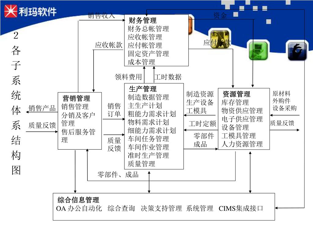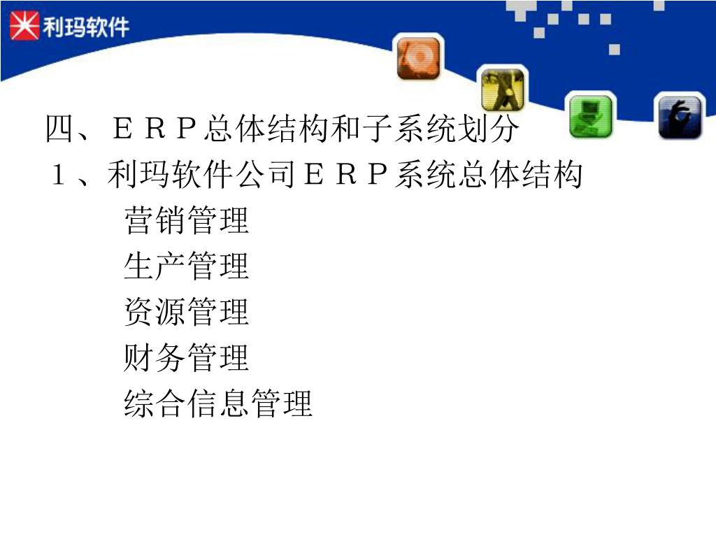 四、ERP总体结构和子系统划分 1、利玛软件公司ERP系统总体结构 营销管理 生产管理 资源管理 财务管理 综合信息管理