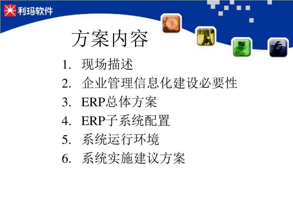 方案内容 • 现场描述 • 企业管理信息化建设必要性 • ERP总体方案 • ERP子系统配置 • 系统运行环境 • 系统实施建议方案