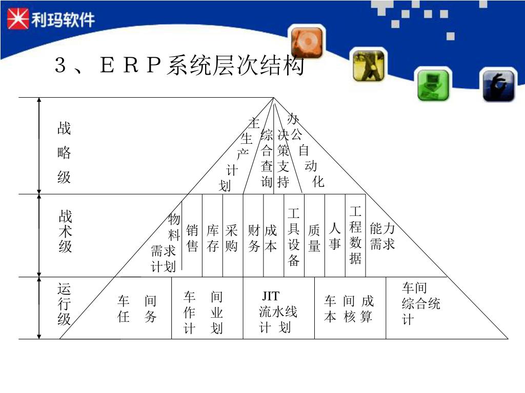 办 公 自 动 化 主 生 产 计 划 战略级 综 合 查 询 决 策 支 持 工 具 设 备 工 程 数 据 战术级 物 料 需求 计划 销 售 库 存 采 购 财 务 成 本 质 量 人 事 能力 需求 车间 综合统 计 运行级 JIT 流水线 计 划 车间 作业 计划 车间 任务 车间成 本 核 算 3、ERP系统层次结构