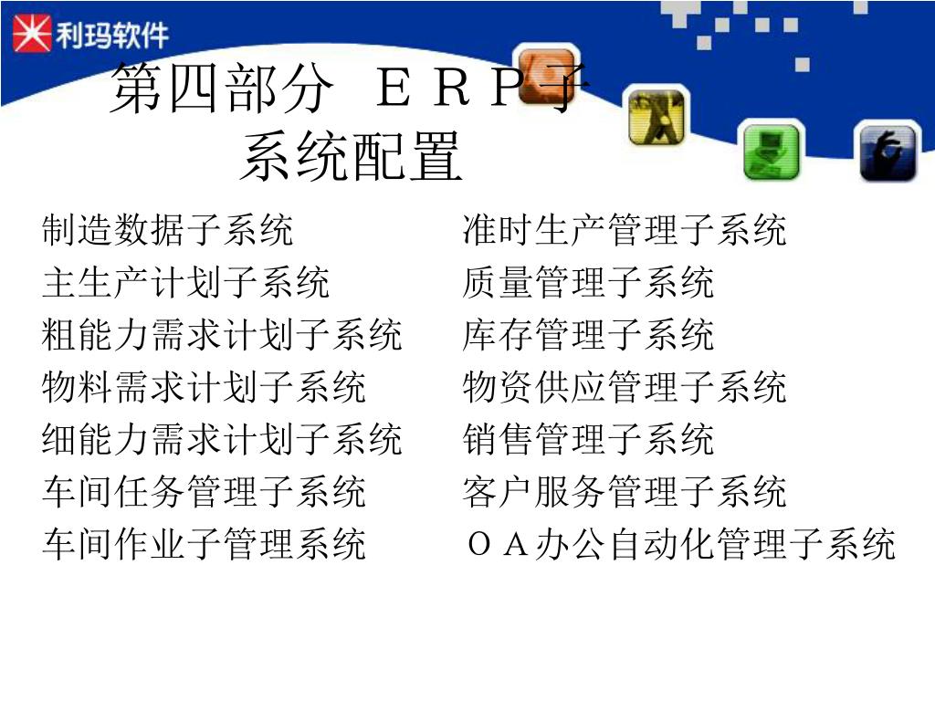 制造数据子系统 主生产计划子系统 粗能力需求计划子系统 物料需求计划子系统 细能力需求计划子系统 车间任务管理子系统 车间作业子管理系统 准时生产管理子系统 质量管理子系统 库存管理子系统 物资供应管理子系统 销售管理子系统 客户服务管理子系统 OA办公自动化管理子系统 第四部分 ERP子系统配置