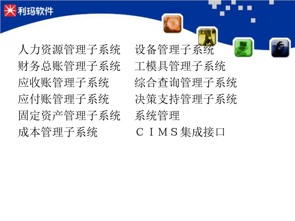 人力资源管理子系统 财务总账管理子系统 应收账管理子系统 应付账管理子系统 固定资产管理子系统 成本管理子系统 设备管理子系统 工模具管理子系统 综合查询管理子系统 决策支持管理子系统 系统管理 CIMS集成接口