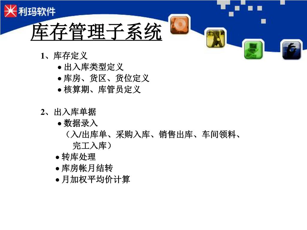 库存管理子系统 1、库存定义 出入库类型定义 库房、货区、货位定义 核算期、库管员定义 2、出入库单据 数据录入 (入/出库单、采购入库、销售出库、车间领料、 完工入库) 转库处理 库房帐月结转 月加权平均价计算