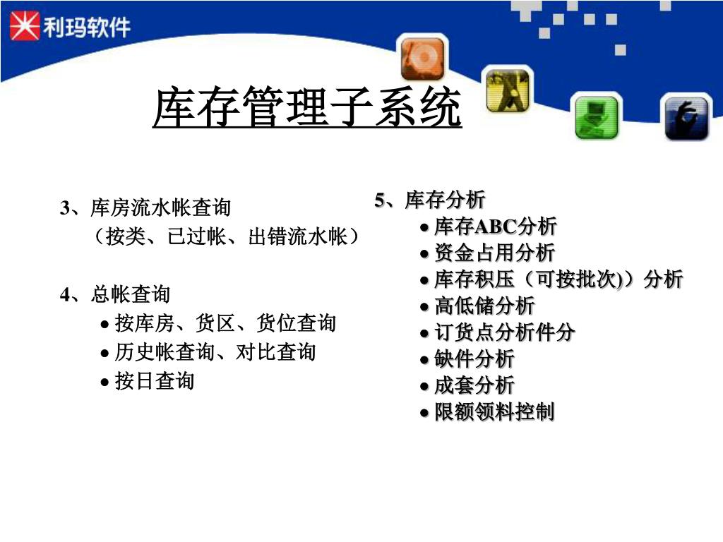 库存管理子系统 3、库房流水帐查询 (按类、已过帐、出错流水帐) 4、总帐查询 按库房、货区、货位查询 历史帐查询、对比查询 按日查询 5、库存分析 库存ABC分析 资金占用分析 库存积压(可按批次))分析 高低储分析 订货点分析件分 缺件分析 成套分析 限额领料控制