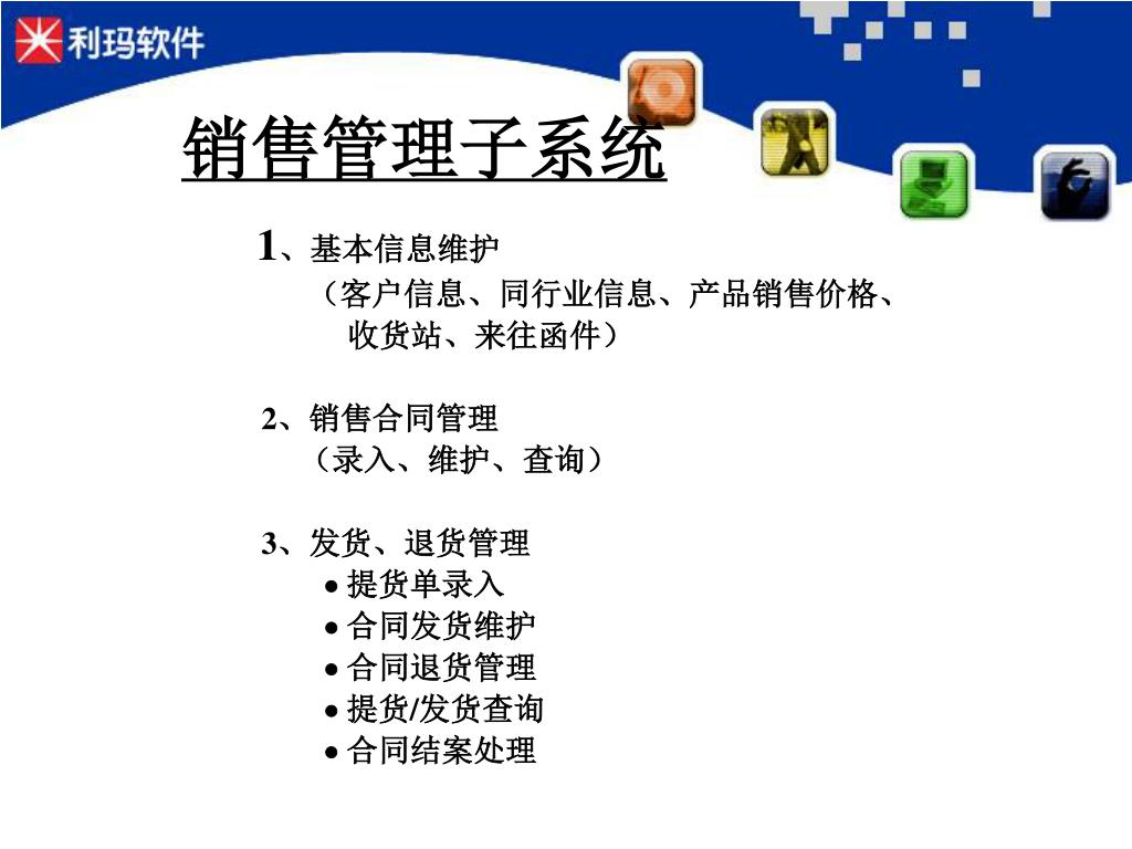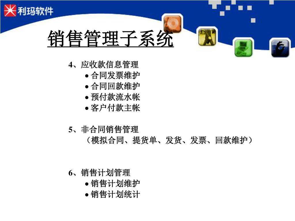 销售管理子系统 4、应收款信息管理 合同发票维护 合同回款维护 预付款流水帐 客户付款主帐 5、非合同销售管理 (模拟合同、提货单、发货、发票、回款维护) 6、销售计划管理 销售计划维护 销售计划统计
