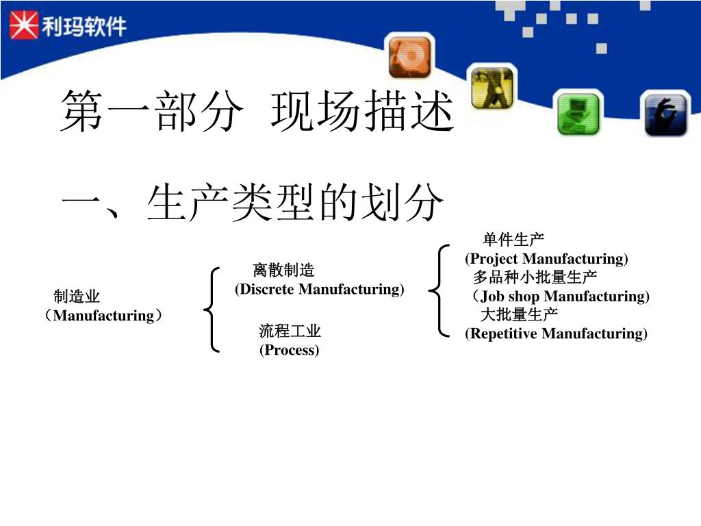 单件生产 (Project Manufacturing) 多品种小批量生产 (Job shop Manufacturing) 大批量生产 (Repetitive Manufacturing) 离散制造 (Discrete Manufacturing) 制造业 (Manufacturing) 流程工业 (Process) 第一部分 现场描述 一、生产类型的划分