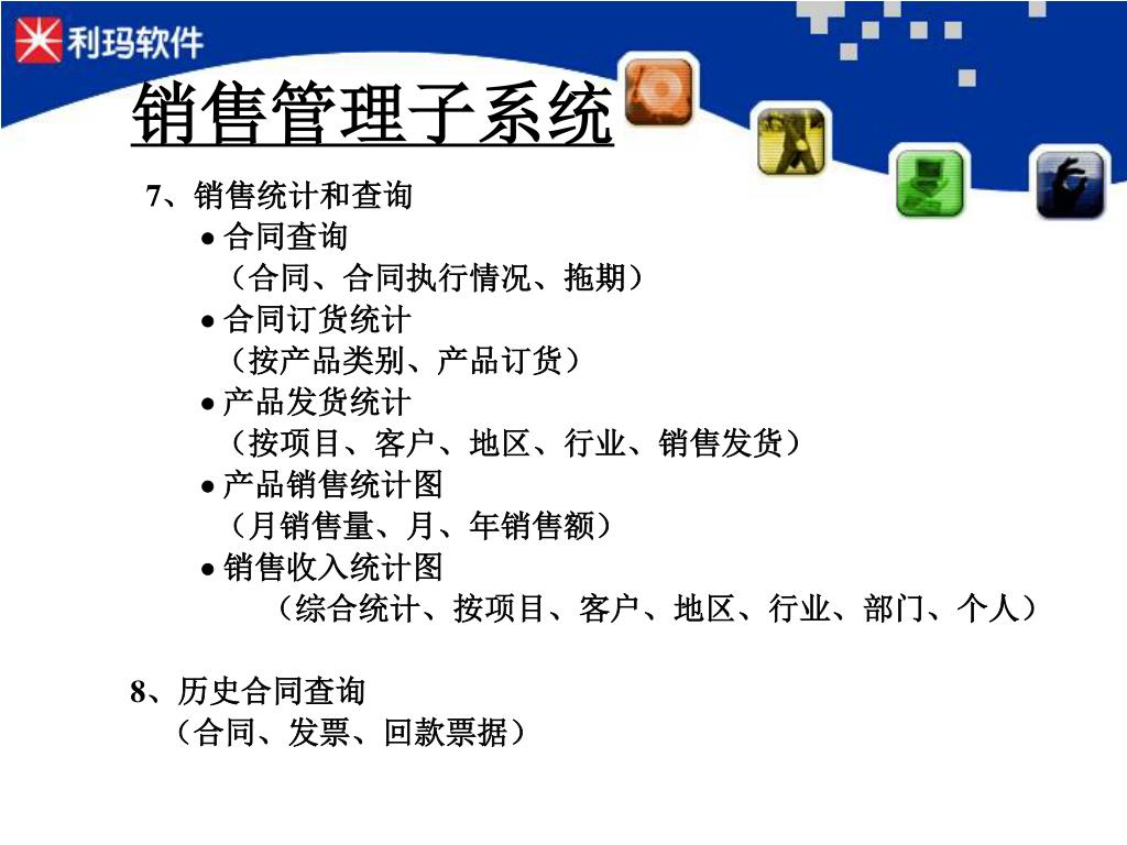 销售管理子系统 7、销售统计和查询 合同查询 (合同、合同执行情况、拖期) 合同订货统计 (按产品类别、产品订货) 产品发货统计 (按项目、客户、地区、行业、销售发货) 产品销售统计图 (月销售量、月、年销售额) 销售收入统计图 (综合统计、按项目、客户、地区、行业、部门、个人) 8、历史合同查询 (合同、发票、回款票据)