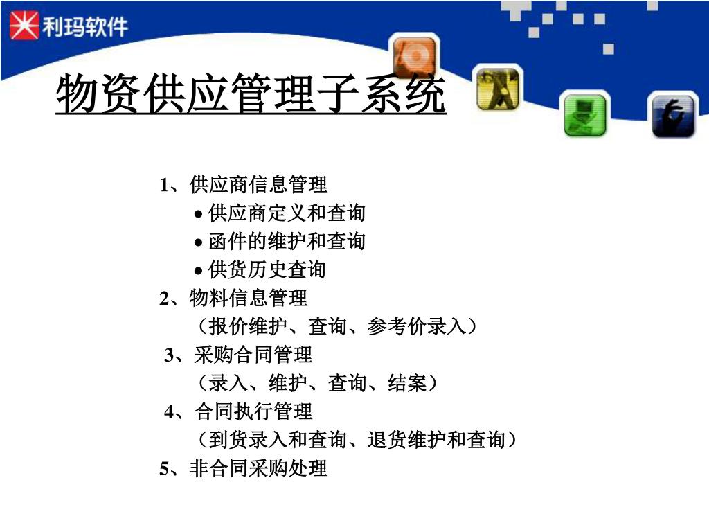 物资供应管理子系统 1、供应商信息管理 供应商定义和查询 函件的维护和查询 供货历史查询 2、物料信息管理 (报价维护、查询、参考价录入) 3、采购合同管理 (录入、维护、查询、结案) 4、合同执行管理 (到货录入和查询、退货维护和查询) 5、非合同采购处理