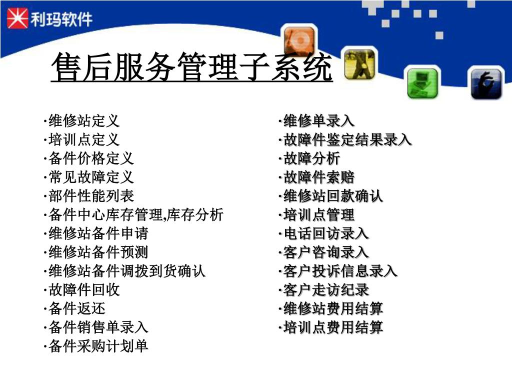 售后服务管理子系统 ·维修站定义 ·培训点定义 ·备件价格定义 ·常见故障定义 ·部件性能列表 ·备件中心库存管理,库存分析 ·维修站备件申请 ·维修站备件预测 ·维修站备件调拨到货确认 ·故障件回收 ·备件返还 ·备件销售单录入 ·备件采购计划单 ·维修单录入 ·故障件鉴定结果录入 ·故障分析 ·故障件索赔 ·维修站回款确认 ·培训点管理 ·电话回访录入 ·客户咨询录入 ·客户投诉信息录入 ·客户走访纪录 ·维修站费用结算 ·培训点费用结算