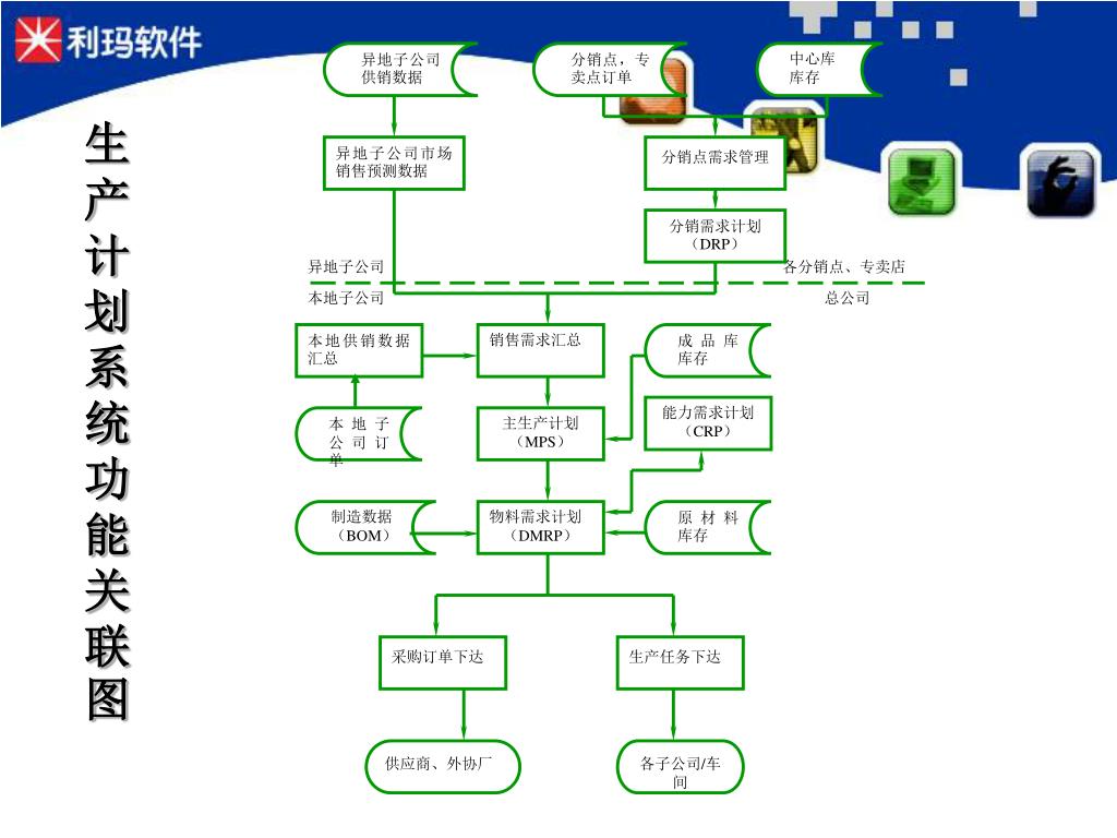 生产计划系统功能关联图 异地子公司供销数据 分销点,专卖点订单 中心库 库存 异地子公司市场销售预测数据 分销点需求管理 分销需求计划(DRP) 异地子公司 各分销点、专卖店 本地子公司 总公司 本地供销数据汇总 销售需求汇总 成品库库存 能力需求计划 (CRP) 本地子公司订单 主生产计划 (MPS) 制造数据 (BOM) 物料需求计划 (DMRP) 原材料库存 采购订单下达 生产任务下达 供应商、外协厂 各子公司/车间