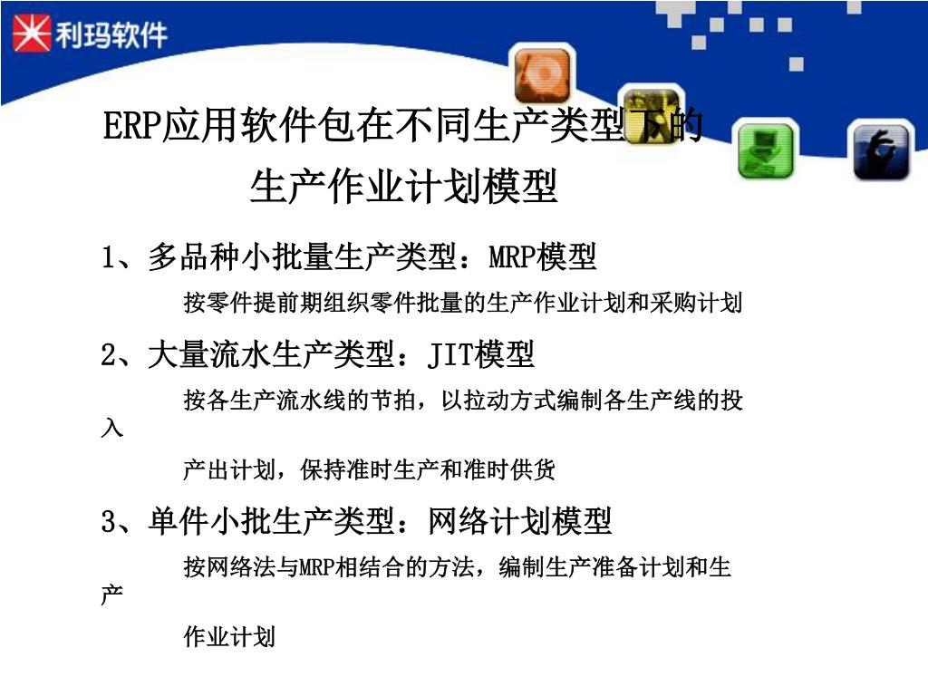 ERP应用软件包在不同生产类型下的生产作业计划模型ERP应用软件包在不同生产类型下的生产作业计划模型 1、多品种小批量生产类型:MRP模型 按零件提前期组织零件批量的生产作业计划和采购计划 2、大量流水生产类型:JIT模型 按各生产流水线的节拍,以拉动方式编制各生产线的投入 产出计划,保持准时生产和准时供货 3、单件小批生产类型:网络计划模型 按网络法与MRP相结合的方法,编制生产准备计划和生产 作业计划