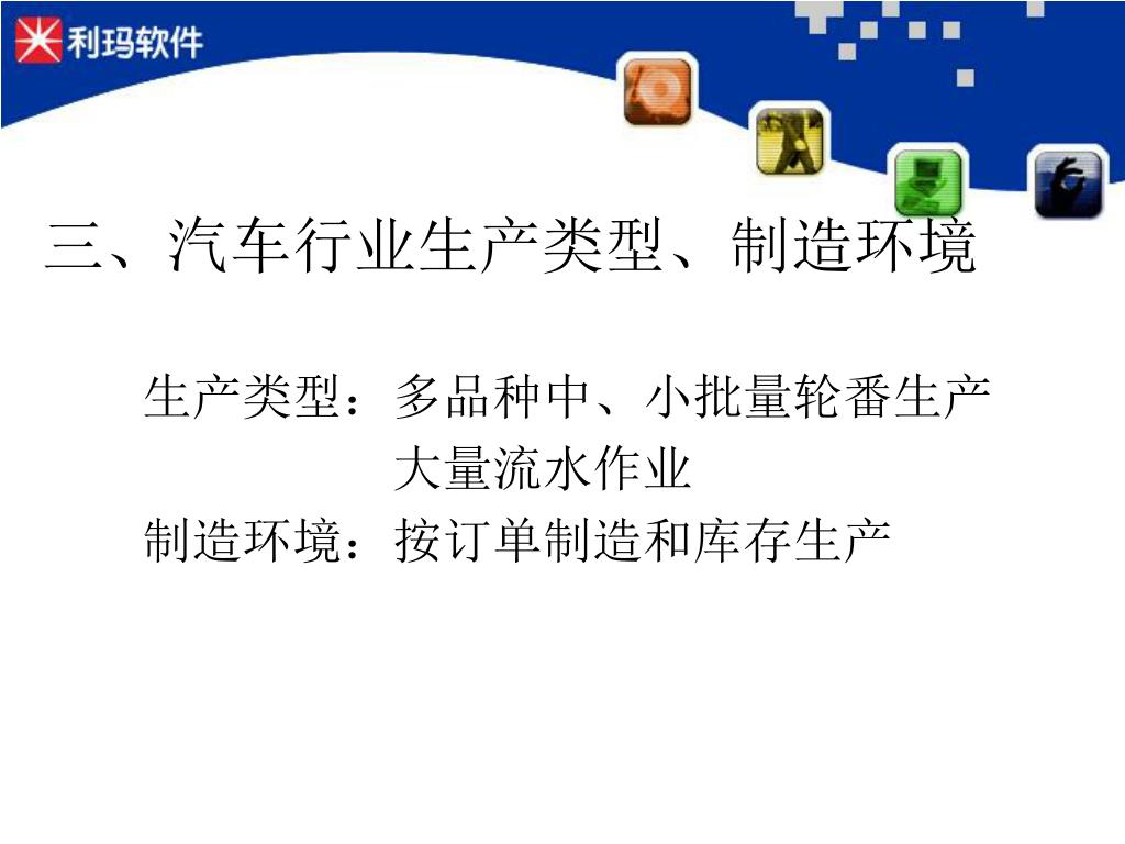 利 玛 软 件. 以客户为中心. 汽车行业管理信息系统建议方案. 北京利玛软件信息技术有限公司. 方案内容. 现场描述 企业管理信息化建设必要性 ERP 总体方案 ERP 子系统配置 系统运行环境 系统实施建议方案. 单件生产 (Project Manufacturing) 多品种小批量生产 ( Job shop Manufacturing) 大批量生产 (Repetitive Manufacturing). 离散制造 (Discrete Manufacturing). 制造业 ( Manufacturing ). 流程工业