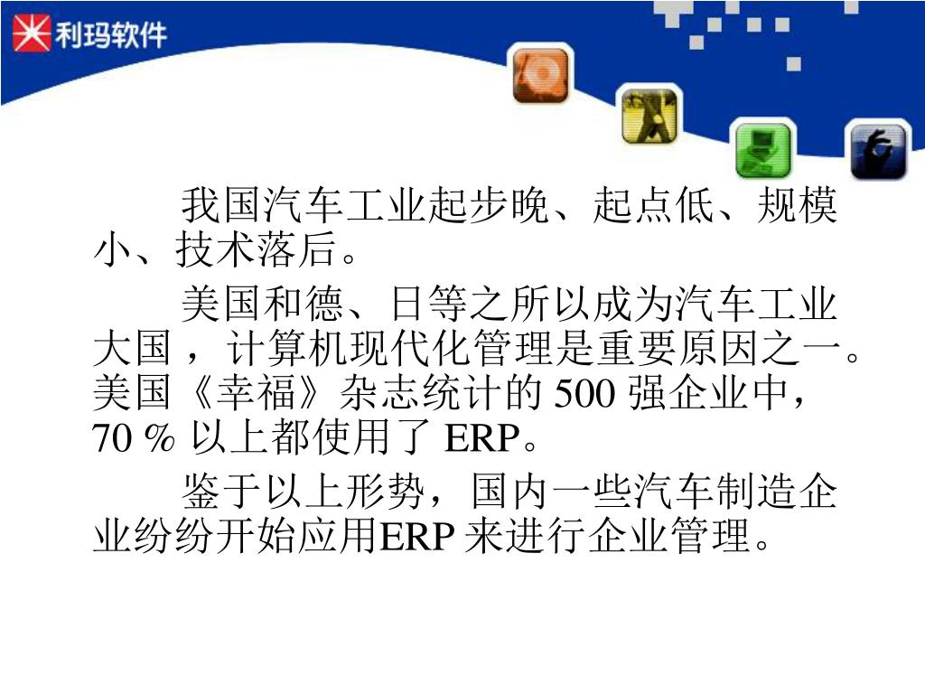 我国汽车工业起步晚、起点低、规模小、技术落后。我国汽车工业起步晚、起点低、规模小、技术落后。 美国和德、日等之所以成为汽车工业大国 ,计算机现代化管理是重要原因之一。美国《幸福》杂志统计的 500 强企业中,70 % 以上都使用了 ERP。 鉴于以上形势,国内一些汽车制造企业纷纷开始应用ERP 来进行企业管理。
