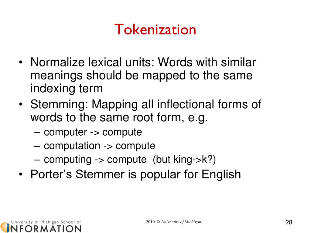 Tokenization • Normalize lexical units: Words with similar meanings should be mapped to the same indexing term • Stemming: Mapping all inflectional forms of words to the same root form, e.g. • computer -> compute • computation -> compute • computing -> compute (but king->k?) • Porter’s Stemmer is popular for English