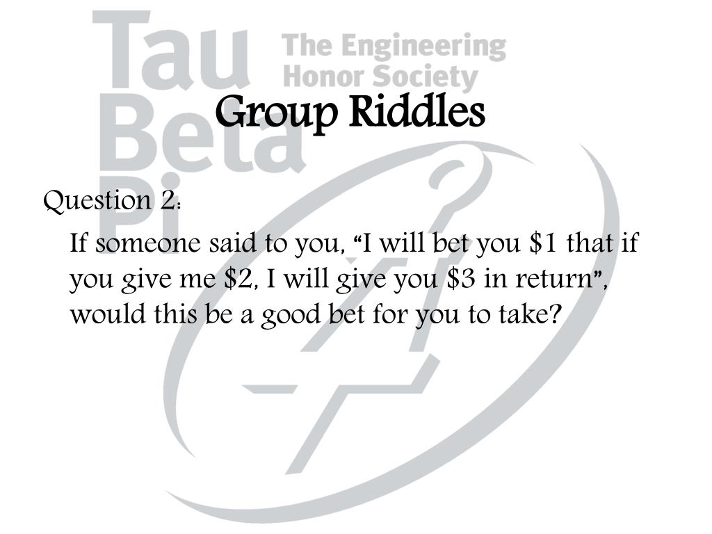 Group Riddles Question 2: If someone said to you, “I will bet you $1 that if you give me $2, I will give you $3 in return”, would this be a good bet for you to take? Answer: No. This is a situation where you lose even if you win. The other person could take your $2 and say, “I lose”, and give you $1 in return. You win the bet, but lose $1.