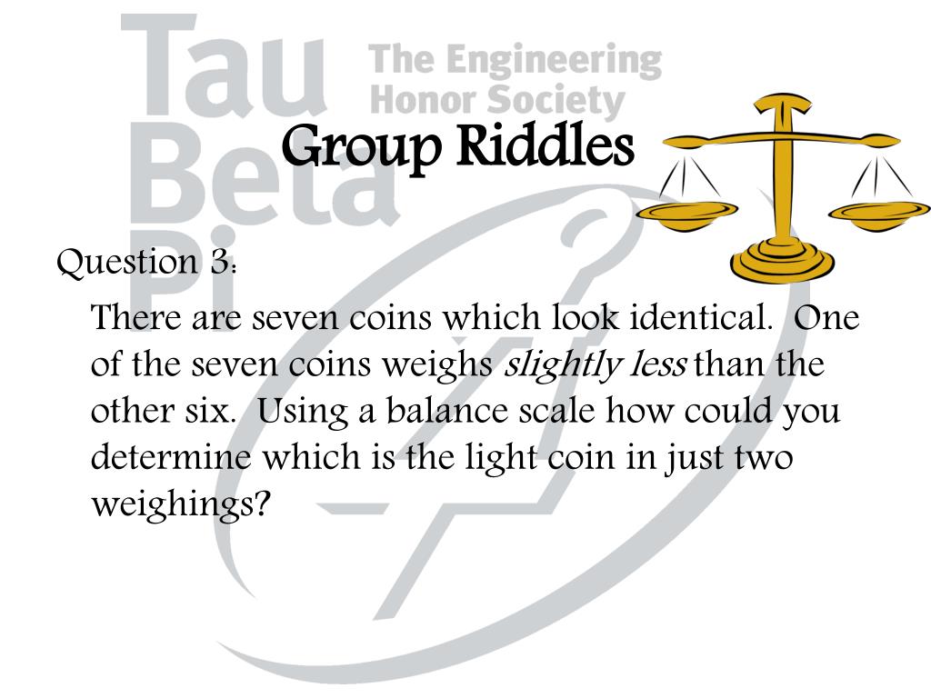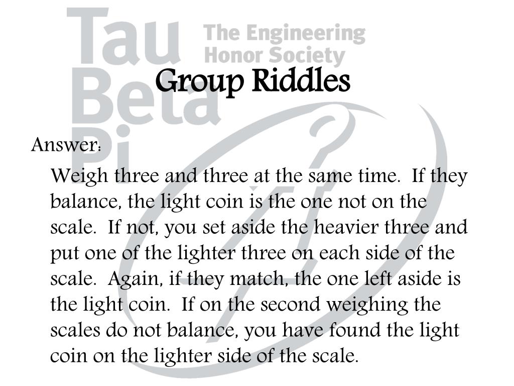Group Riddles Answer: Weigh three and three at the same time. If they balance, the light coin is the one not on the scale. If not, you set aside the heavier three and put one of the lighter three on each side of the scale. Again, if they match, the one left aside is the light coin. If on the second weighing the scales do not balance, you have found the light coin on the lighter side of the scale.
