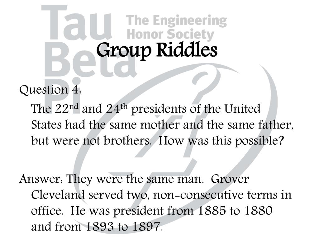 Group Riddles Question 4: The 22nd and 24th presidents of the United States had the same mother and the same father, but were not brothers. How was this possible? Answer: They were the same man. Grover Cleveland served two, non-consecutive terms in office. He was president from 1885 to 1880 and from 1893 to 1897.