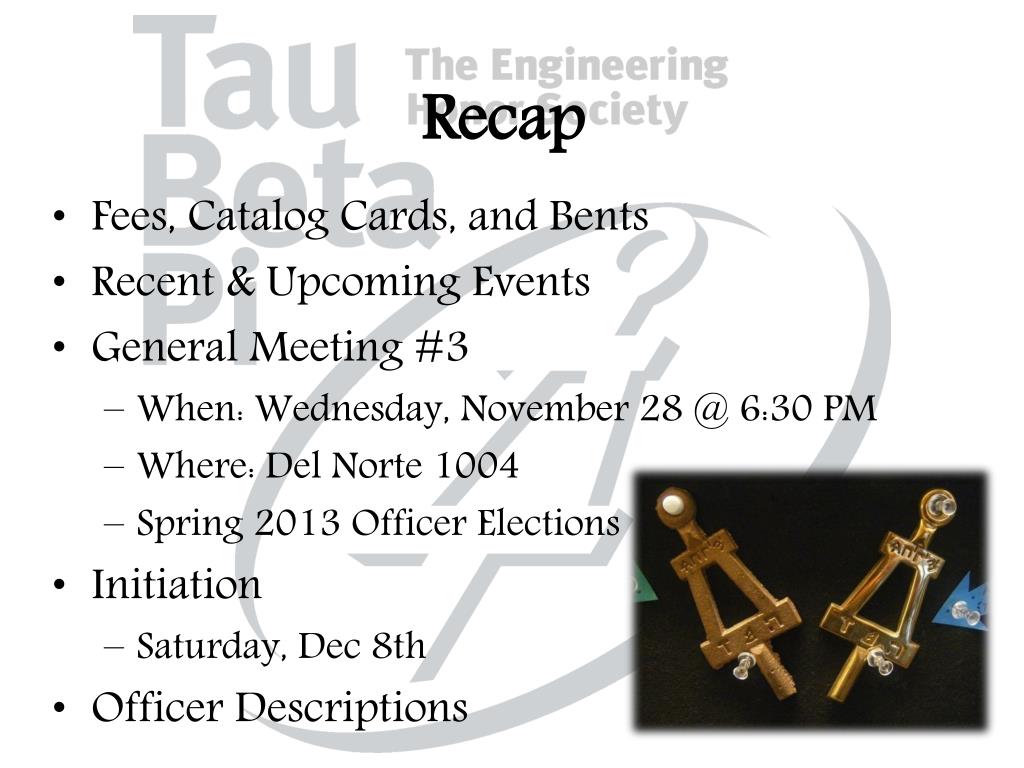 Recap • Fees, Catalog Cards, and Bents • Recent & Upcoming Events • General Meeting #3 • When: Wednesday, November 28 @ 6:30 PM • Where: Del Norte 1004 • Spring 2013 Officer Elections • Initiation • Saturday, Dec 8th • Officer Descriptions