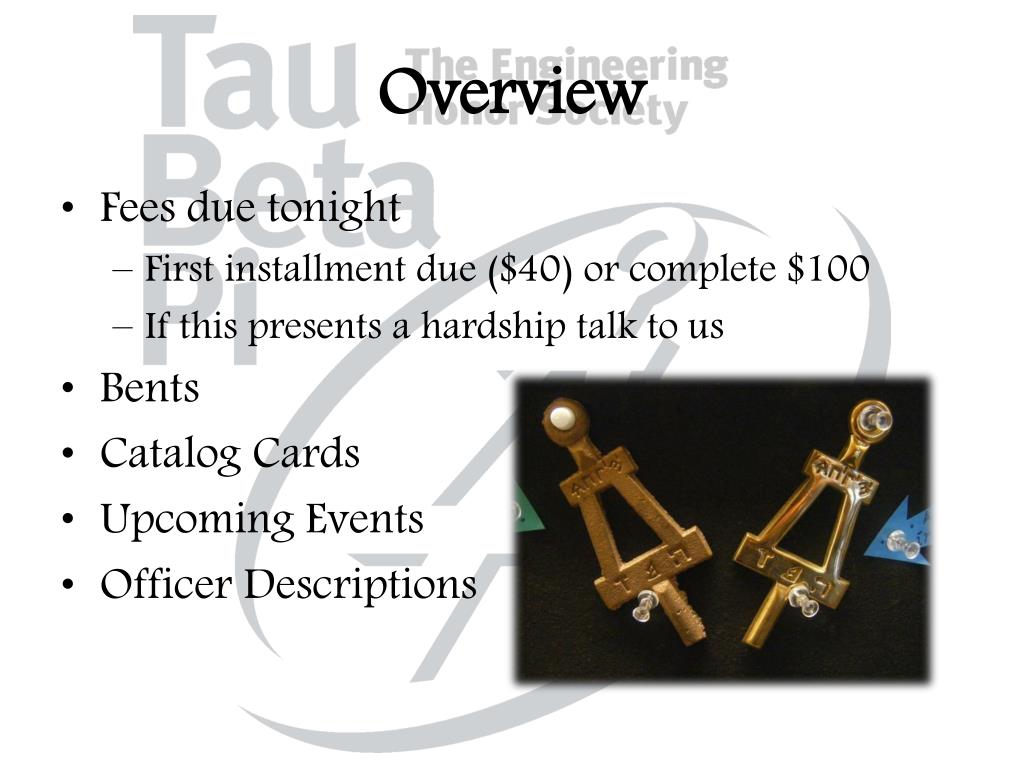 Overview • Fees due tonight • First installment due ($40) or complete $100 • If this presents a hardship talk to us • Bents • Catalog Cards • Upcoming Events • Officer Descriptions